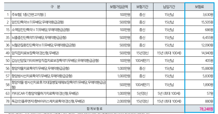 항암 약물방사선 치료후 70대 질병 및 재해보장 특약넣고 보험료 1,890